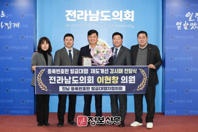![]() 전라남도의회 이현창 의원, 등록번호판 발급대행자협의회로부터 감사패 수상 |