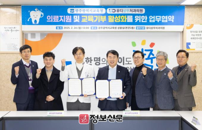 광주시교육청과 유디상무치과의원은 24일 본청 상황실에서 ‘치과치료 지원을 위한 업무협약’을 체결했다. 이번 협약은 학생들에게 구강 관리의 중요성 등을 알리기 위해 마련됐다.