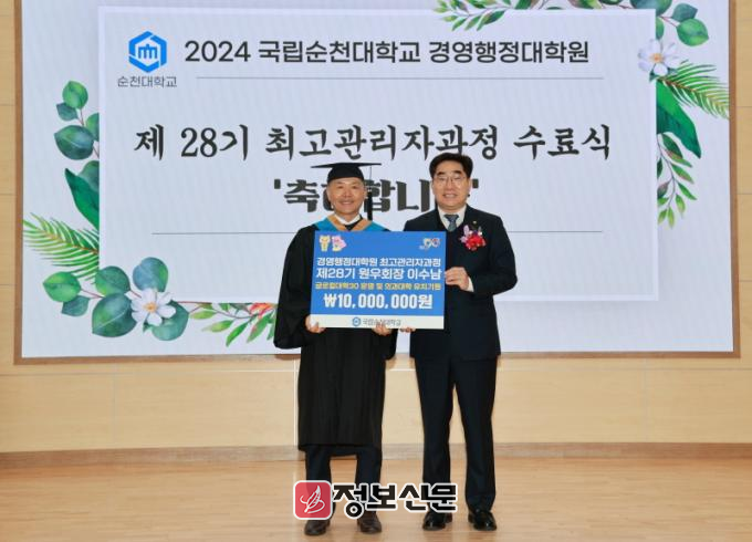 기탁식은 15일 국립순천대학교 경영행정대학원 최고관리자과정 수료식장에서 진행됐으며, 이병운 총장과 대학 관계자, 기탁자인 제28기 이수남 원우회장, 경영행정대학원 제25대 김영태 총동창회장 및 역대 총동창회장 등이 참석했다.