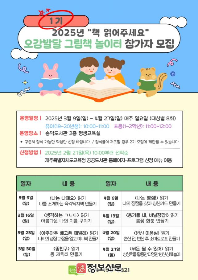 ‘책 읽어주세요 1기’는 유아(5 ~ 6세), 초등 1 ~ 2학년 각 15명을 대상으로 다음달 9일부터 오는 4월 27일까지 매주 일요일에 진행되며 미술 융합 그림책 놀이를 통해 오감을 발달시킬 수 있도록 창의적 표현 활동과 독후활동으로 진행된다.