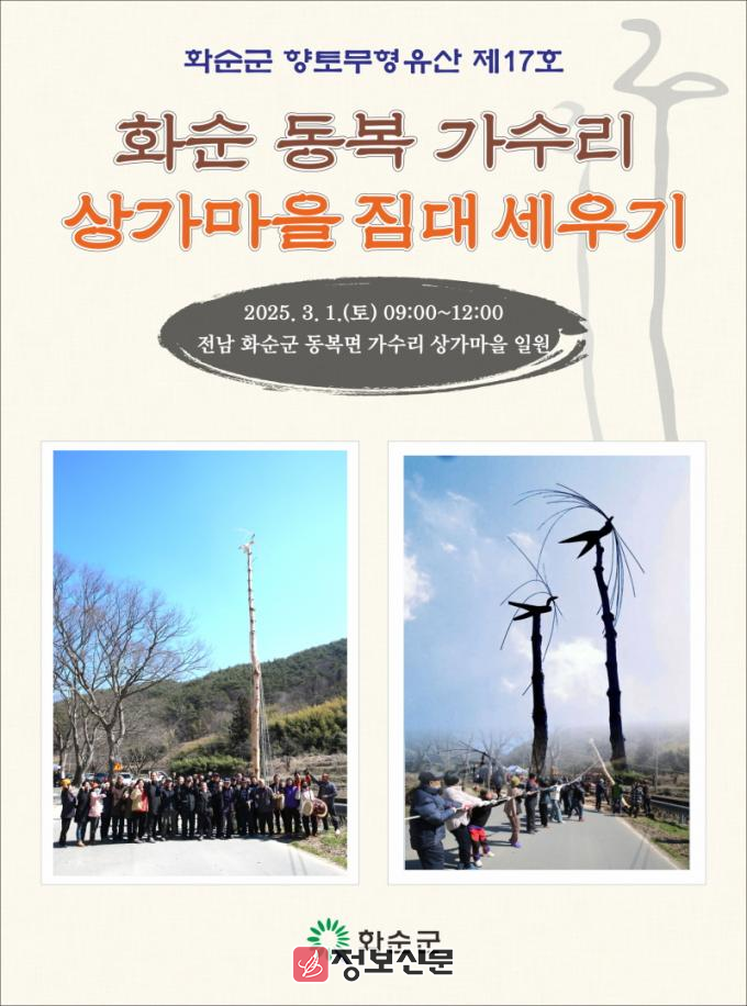 ![]() 화순군 동복 가수리 상가마을, '2025 을사년 짐대(솟대) 세우기' 민속놀이 예고 |