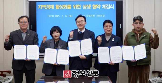 나주시(시장 윤병태)는 지난 24일 나주시의회(의장 이재남), 한국외식업중앙회·대한미용사회 나주시지부, 공공배달앱 먹깨비 대표 관계자와 ‘지역경제 활성화를 위한 상생 협약식’을 가졌다고 25일 밝혔다.
