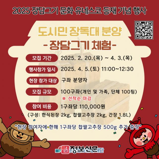 ![]() 순창군, 유네스코 등재 기념 도시민 장독대 분양 체험 참가자 모집 |