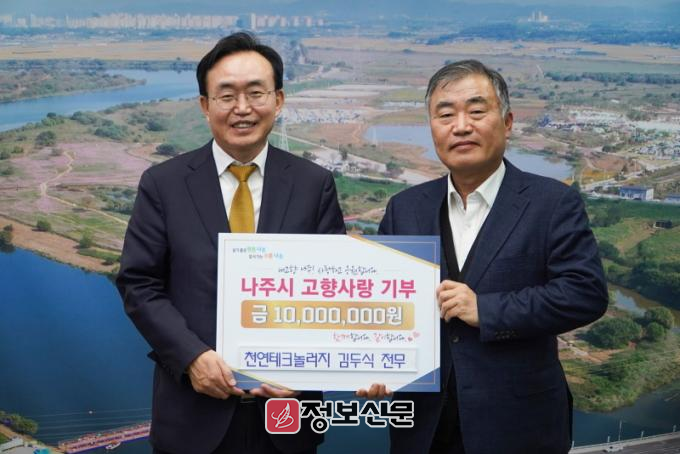 ![]() 천연테크놀러지 김두식 전무가 나주시에 고향사랑기부금 1천만 원을 기탁했다. (사진제공-나주시)
