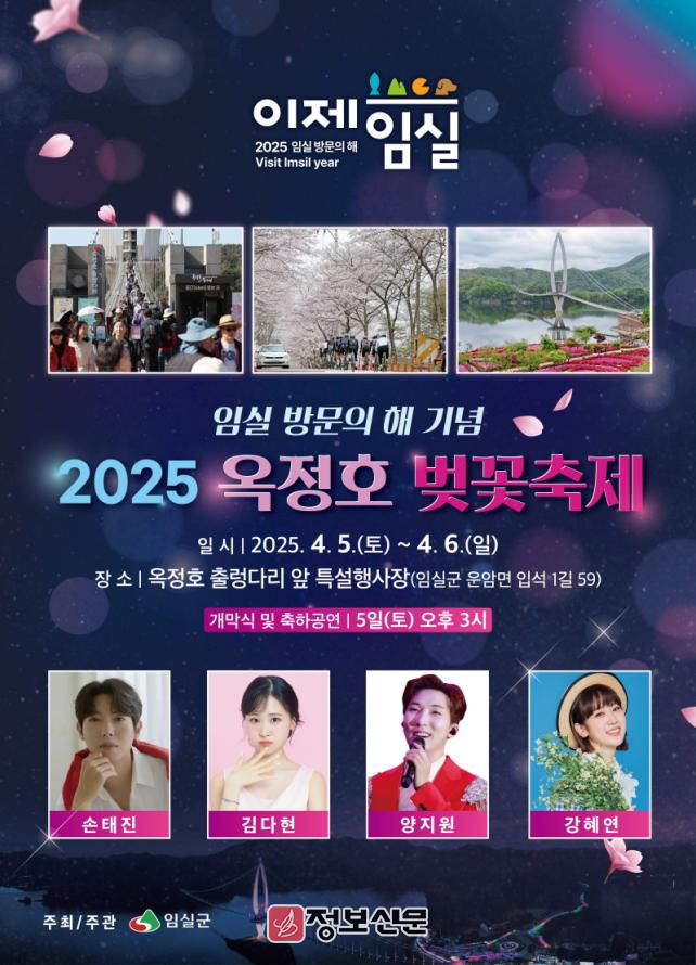 임실군은 봄의 시작을 알리는 화려한 벚꽃 시즌에 전북특별자치도 대표 관광지인 옥정호 출렁다리 앞 광장과 붕어섬 생태공원 일원에서 2025 옥정호 벚꽃축제가 성대하게 열린다고 27일 밝혔다.