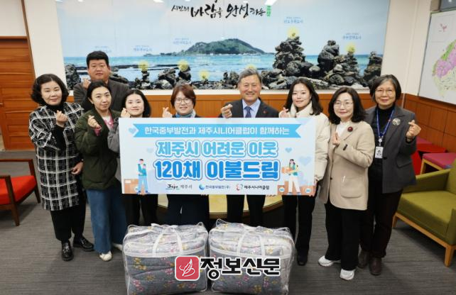 이번 기탁은 제주시니어클럽이 추진한 노인일자리 사업을 통해 창출된 수익금으로 구입한 이불 120채(960만 원 상당)를 지역사회에 기증하기 위해 마련됐다.