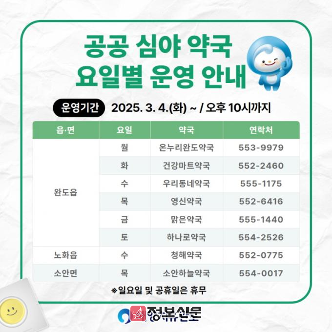![]() 완도군, 3월부터 공공 심야 약국 8개소 운영 |