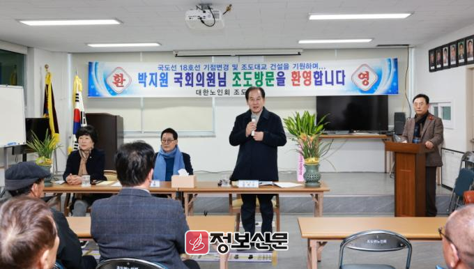 조도면 노인회 사무실에서 진행된 이날 간담회에는 박지원 국회의원, 김희수 진도군수, 박금례 진도군의회의장, 김인정 도의원, 주만종 군의원과 조도면 노인회, 신조도대교 건설추진위원회, 톳생산자 협의회, 조도면 기관사회단체장 등이 참석했다.