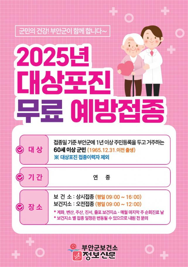 ![]() 부안군, 60세 이상 대상포진 무료 예방접종 확대 시행 |