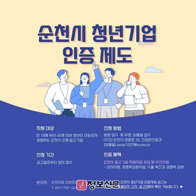 ![]() 순천시, 청년기업 지원을 위한 인증사업 시행 |