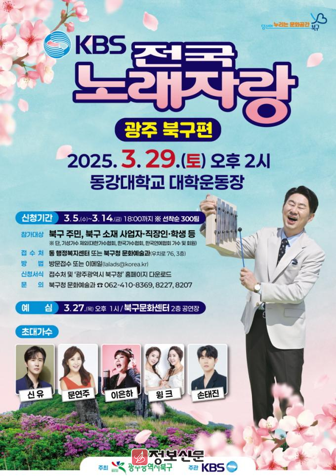 4일 북구에 따르면 ‘KBS 전국노래자랑 광주 북구편’이 오는 29일 오후 2시부터 동강대학교 운동장에서 열린다. 이번 행사는 주민들에게 화합과 소통의 장을 제공하고 북구의 관광 자원을 전국에 알려 지역 관광 활성화에 기여하고자 마련됐다.