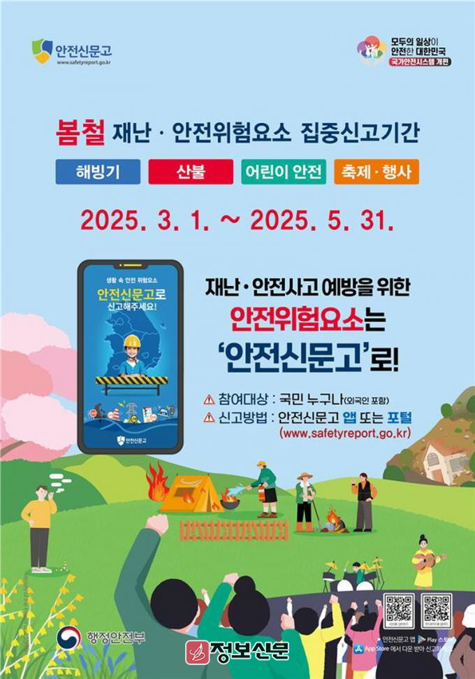 ‘안전신문고’는 국민 누구나 생활 주변의 재난ㆍ안전 위험 요소를 사진이나 동영상으로 촬영해 신고할 수 있는 시스템으로, 이번 집중 신고 기간에는 봄철 빈발하는 신고와 최근 이슈 등을 반영해 선정된 총 4개 유형을 운영한다.