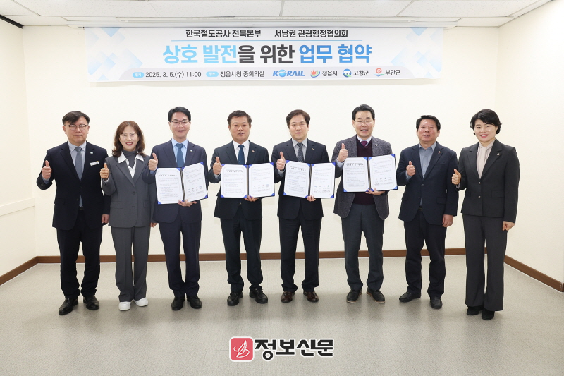 양측은 5일 정읍시청 중회의실에서 상생협력 업무협약을 체결했다. 이날 협약식에는 이두희 전북본부장과 이학수 정읍시장, 권익현 부안군수, 심덕섭 고창군수가 참석해 ‘서남권 관광행정협의회 및 한국철도공사 전북본부 상생협력 업무협약서’에 서명했다.