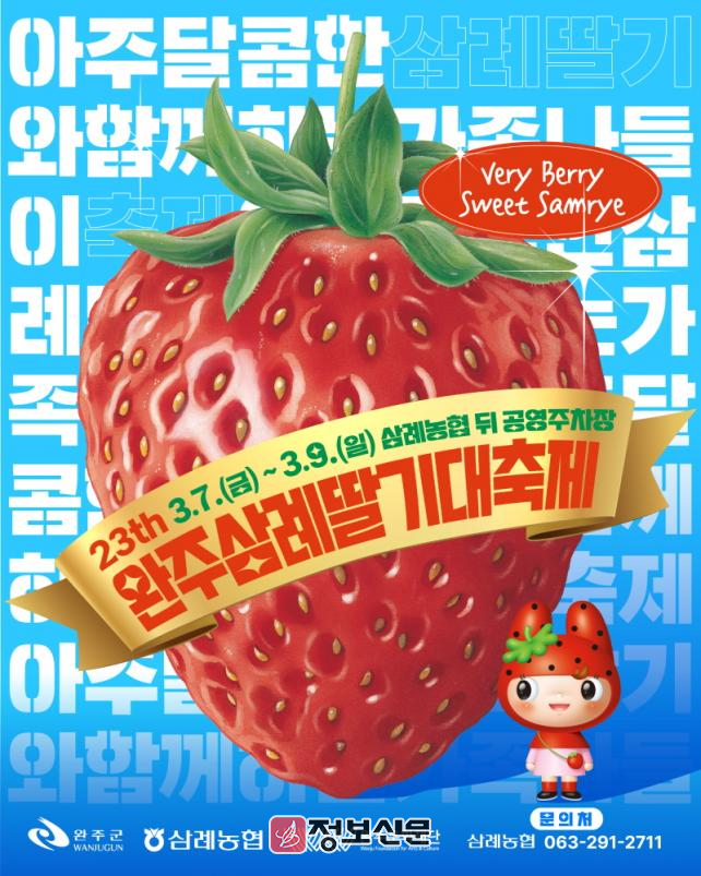 5일 완주 삼례딸기축제제전위원회는 오는 7일부터 9일까지 삼례농협 인근 공영주차장 일원에서 ‘제23회 완주 삼례딸기 대축제’를 연다고 밝혔다.