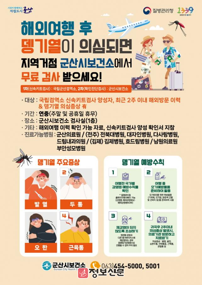 군산시보건소는 지역사회 감염 확산 및 국내 뎅기열 토착화 방지에 대비하기 위해 뎅기열 유증상자 진료 및 확인 진단검사를 무료로 실시하며 적극적으로 대응할 계획이다.