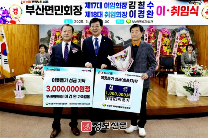행사에 앞서 이경환 신임 면민회장님과 부산면 출신 이문기님께서 취약 계층을 위한 이웃돕기 성금을 기탁하여 행사에 의미를 더했다. 이어서 김칠수 前면민회장의 공로패 수여와 이임사, 신임 면민회장의 취임사 순으로 진행됐다.