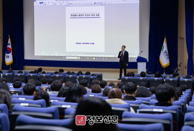 조석훈 전라남도 정책기획관이, 2/26일 영암군청에서 열린 ‘공직자 직무 전문교육’ 첫 번째 강좌 ‘정책기획력 향상’에서 기본기를 강조했다. 공직자들이 정책을 효과적으로 수립·시행하려면 기획보고서 작성이 중요하다고 전한 것.