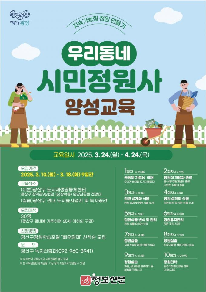 우리동네 시민정원사 양성에 관한 자세한 사항은 광산구 녹지산림과(092-960-3941)로 문의하면 된다.