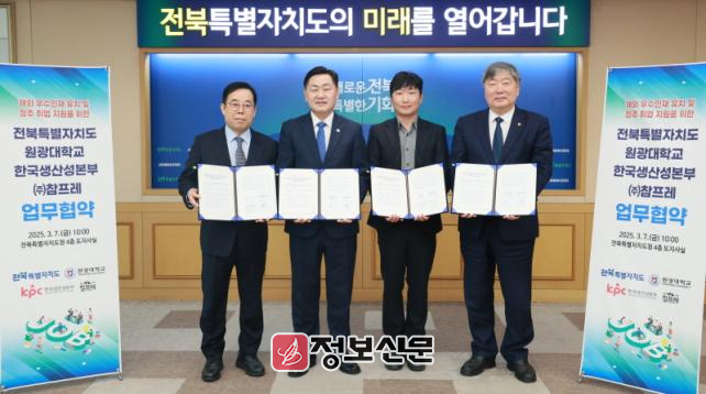 전북자치도는 7일 원광대학교, 한국생산성본부, ㈜참프레와 외국인 유학생의 취업 및 창업을 지원하는 협약을 체결했다.