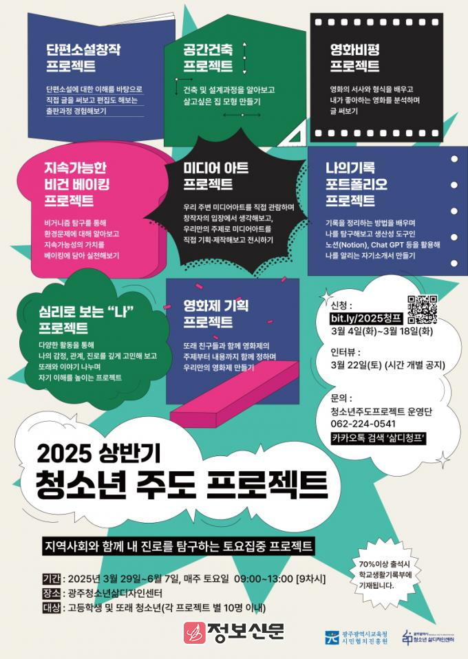 상반기 프로젝트는 오는 29일부터 6월 7일까지 매주 토요일 광주청소년삶디자인센터에서 ▲심리로 보는 “나” ▲영화제 기획 ▲나의 기록 포트폴리오 ▲공간건축 ▲단편소설창작 ▲미디어아트 ▲영화비평 ▲지속가능한 비건 베이킹 등 8개 과정으로 운영된다.