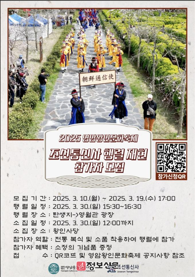 영암문화관광재단 축제도시팀 관계자는“조선통신사 행렬은 단순한 축제 행사가 아니라, 한·일 간 역사적 유대를 되새기고 전통문화를 계승하는 중요한 행사”라며 “철저한 고증과 수준 높은 연출로 역사적 현장을 그대로 재현할 계획”이라고 밝혔다. 끝으로 2025 영암왕인문화축제는 3월 29일부터 4월 9일까지 영암군 일대에서 진행되며, 조선통신사 행렬은 30일(일요일) 선보일 예정이다.