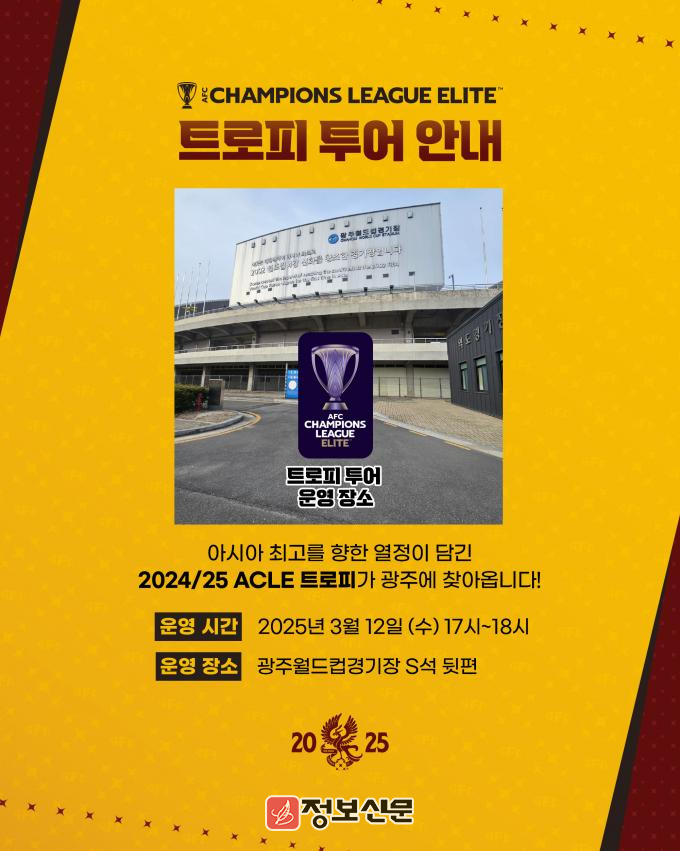 구단 관계자는 “대한민국에서 유일하게 ACLE 토너먼트에 진출한 광주에서 아시아 정상의 트로피를 선보일 수 있어 영광이다”라며 “광주 방문의 해를 맞아 전국의 축구 팬들이 트로피를 보기 위해 광주에 찾아오는 축제의 장이 되기를 기대한다”고 전했다.