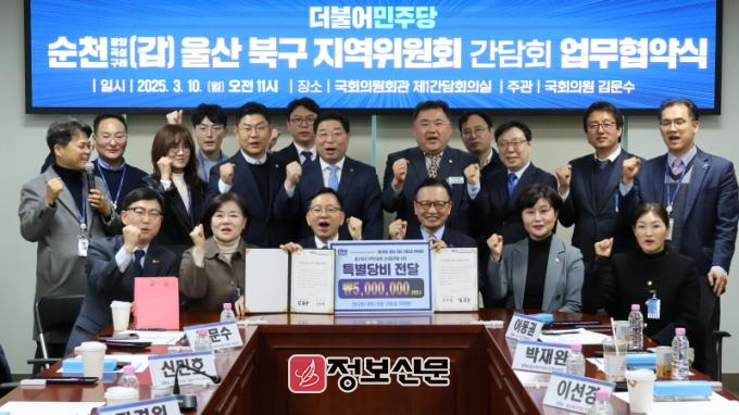 행사는 ▲순천 갑·울산북구 지역 추진사업 현황과 협력방안 논의 ▲더불어민주당 전라남도당 특별당비 500만원 전달식 ▲순천갑-울산북구 상호협력을 위한 현판식 게시 등이 진행됐다.