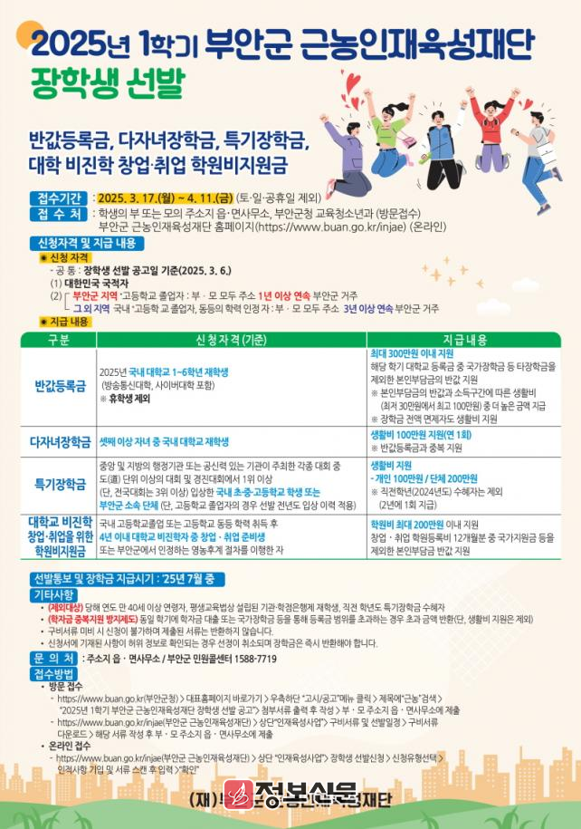 ![]() 부안군 근농인재육성재단, 2025년 1학기 장학생 신청 접수 |