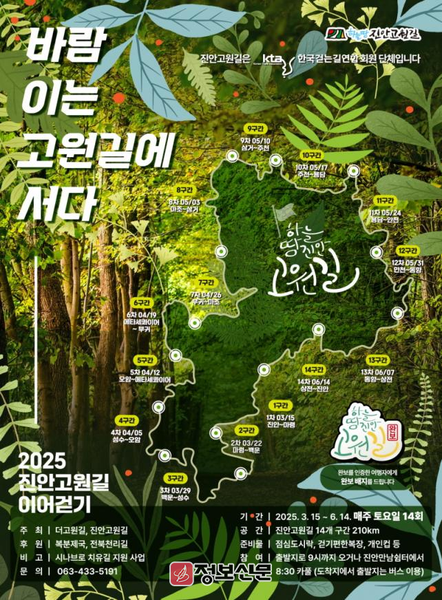 ![]() 진안군, 2025년 진안고원길 이어걷기 프로젝트 ‘바람 이는 고원길에 서다’ 시작 |