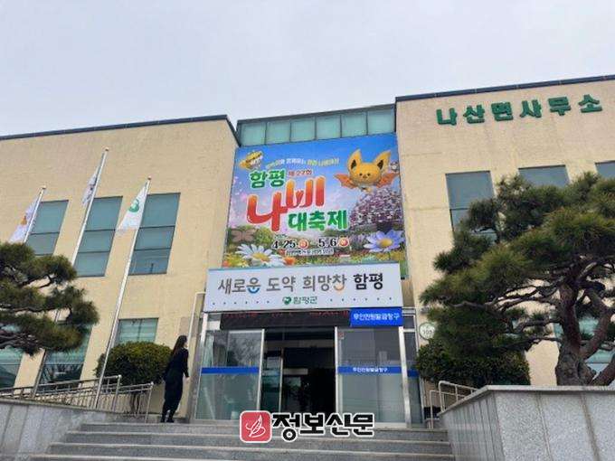 함평군은 11일 “나산면사무소가 지난 10일 청사에 대형현수막을 설치해 지역 주민과 방문객들에게 제27회 함평나비대축제를 알리며 관심과 참여를 장려하고 있다”고 밝혔다.