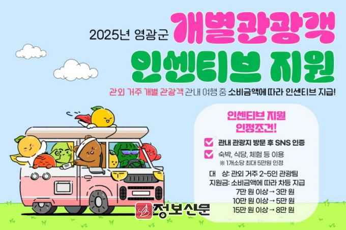 영광군 개별관광객 유치 인센티브 지원사업은 관광객 유치를 도모하고 지역경제 활성화를 견인하기 위해 여행경비 일부를 지원하는 사업으로 연내 예산 소진 시까지 진행된다.