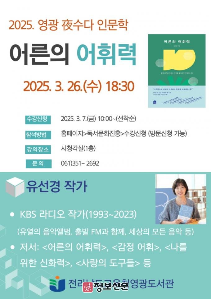 ![]() 영광도서관, 수요일 밤의 夜수다 인문학 강연 운영 |