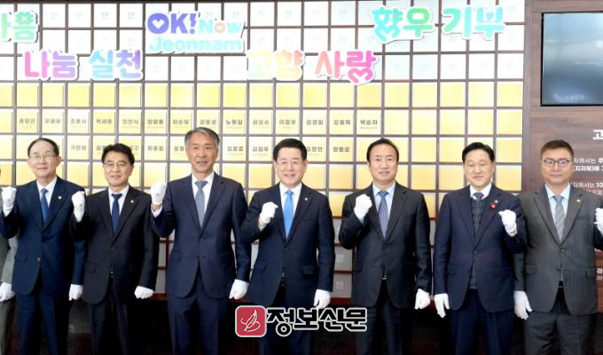 ![]() 김영록 전라남도지사가 11일 도청 윤선도홀에서 열린 ‘고향사랑기부제 명예의 전당 제막식’ 행사에서 명예의 전당 의미를 담은 명패를 수여하는 헌액식을 마치고 기념촬영을 하고 있다.