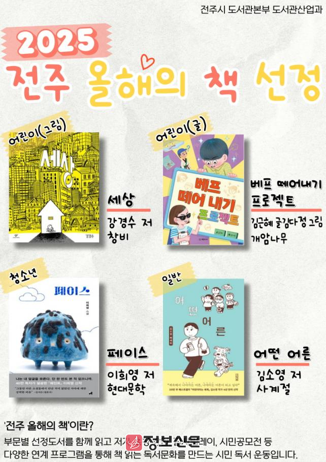 전주시는 ‘2025 전주 올해의 책’으로 △세상(강경수 저, 창비) △베프 떼어내기 프로젝트(김근혜 글·김다정 그림, 개암나무) △페이스(이희영 저, 현대문학) △어떤 어른(김소영 저, 사계절) 등 총 4권의 도서를 선정했다고 11일 밝혔다.