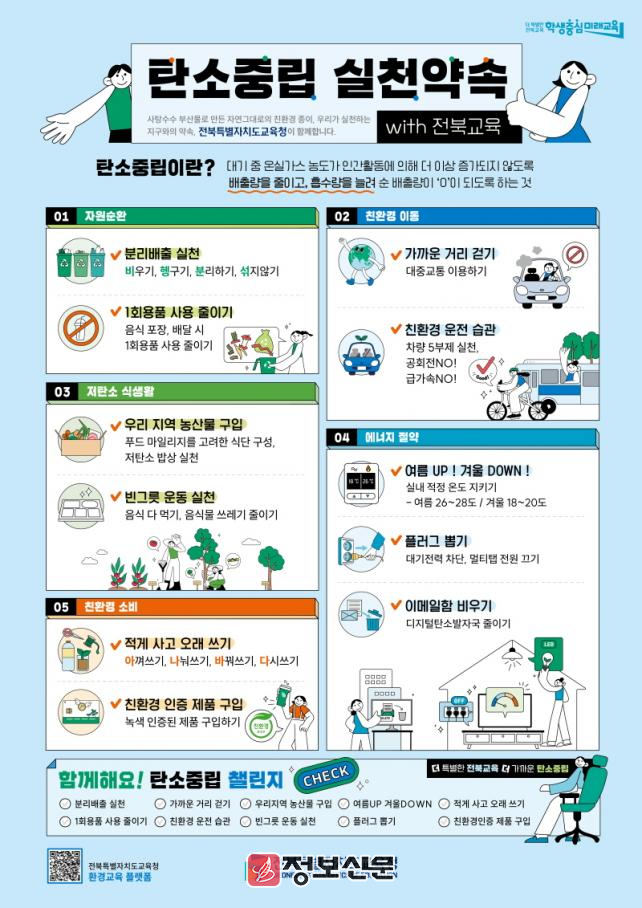 ‘탄소중립 실천 약속 with 전북교육’이라는 이름으로 제작된 포스터는 사탕수수 부산물을 활용한 친환경 종이로 제작됐으며, 리플릿은 파일로만 배포해 불필요한 자원 낭비를 줄이도록 했다.
