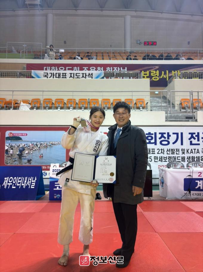 ![]() 여자부 –63kg급에서 우승을 차지한 신채원 선수와 김양호 순천시청 유도팀 감독 |