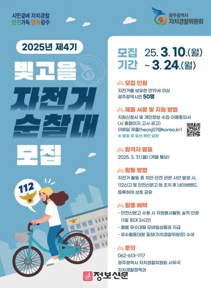 ![]() 광주광역시자치경찰위원회, 빛고을 자전거 순찰대 모집 |