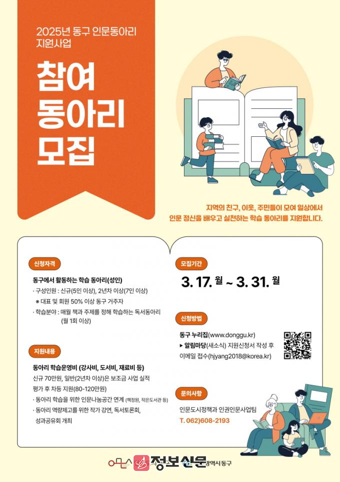 ![]() 광주시 동구, 2025년 인문 동아리 지원사업 참여 동아리 모집 |