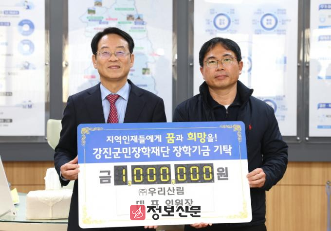 강진읍 보은로에 위치한 ㈜우리산림은 숲 가꾸기, 풀베기, 해충방제 등 다양한 산림조경 사업을 하는 기업으로 2018년 설립 이후 꾸준히 장학금 기탁 행렬에 앞장서고 있다. 임원장 ㈜우리산림 대표는“재능 있는 학생들이 성장해 지역과 국가 경쟁력을 높이는 인재로 성장하길 바라는 마음에서 장학금을 기탁했다”며 “앞으로도 지역 사회 인재들이 평등한 교육 기회를 받을 수 있도록 아낌없는 후원을 이어나갈 것”이라고 말했다.