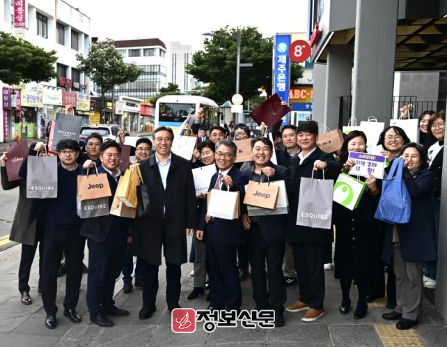 오순문 시장은 중정로 일대 상점에서 제주지역 화폐 ‘탐나는전’을 활용하여 생활용품을 구매하며 지역상권 이용을 독려했다. 자치행정국장과 직원들도 함께 동참하여 소비 촉진 분위기를 조성했다.
