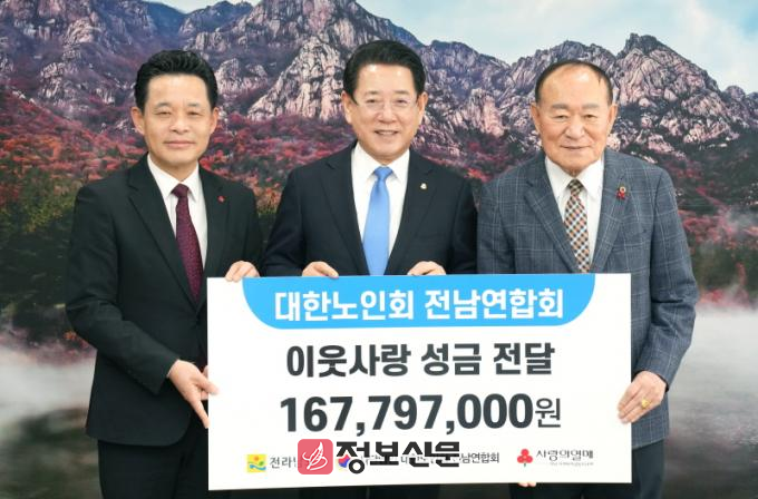 정양수 대한노인회 전남연합회장은 “전남도에서 노인복지에 깊은 관심을 보여줘 항상 고맙게 생각한다”며 “앞으로도 지역사회를 위한 나눔 활동에 적극 동참하겠다”고 밝혔다.