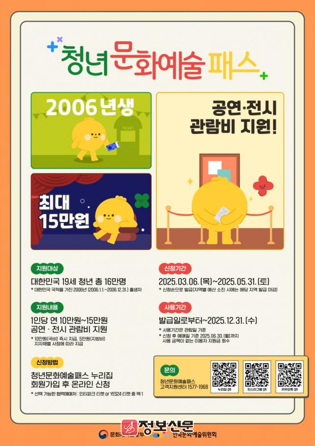 ‘청년문화예술패스’는 문화체육관광부가 주관하는 사업으로 2006년생 청년들에게 연극·뮤지컬·클래식·대중가수 콘서트 등 공연과 전시 관람을 통해 문화 접근성을 높이고 문화 소비 주체로 성장할 수 있도록 돕는다.