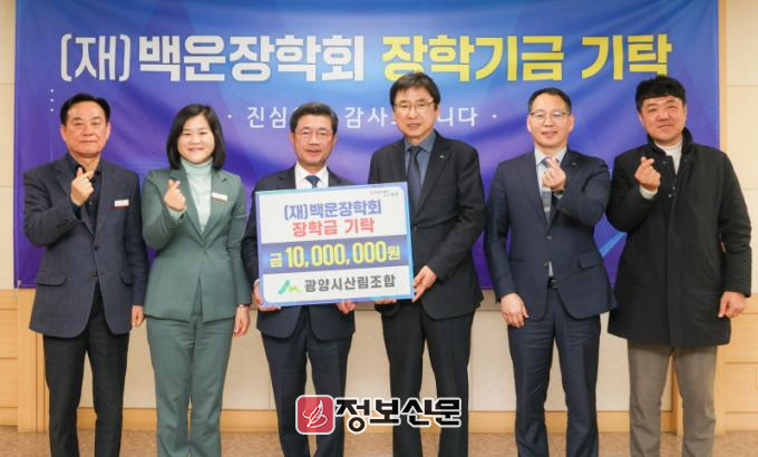 광양시산림조합은 2016년 5백만 원, 2022년 1천만 원에 이어 올해도 학생들이 경제적 어려움 없이 학업에 매진할 수 있도록 1천만 원을 후원해 총 2천5백만 원을 기탁했다.