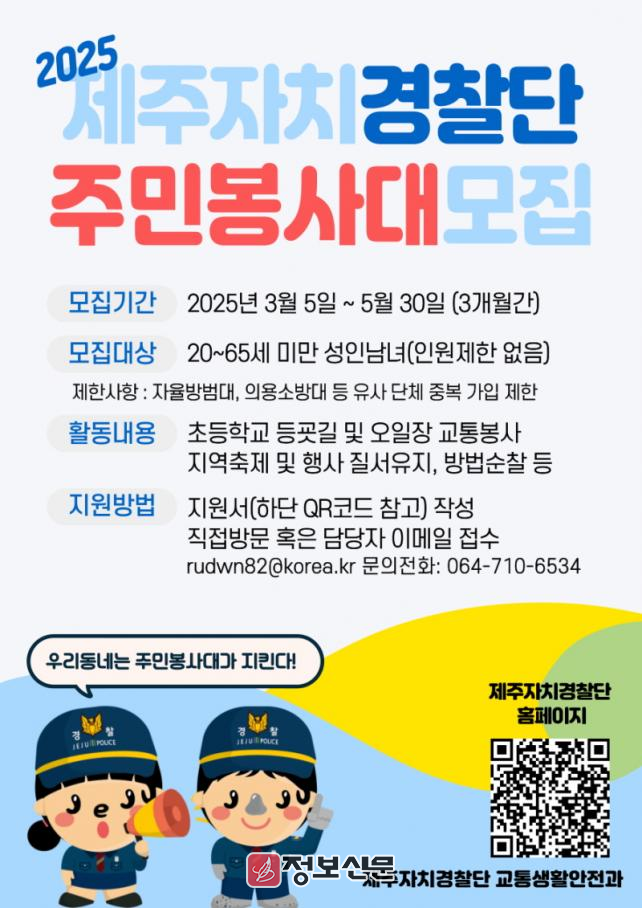 ![]() 제주특별자치도 자치경찰단, 우리 동네 지킴이 ‘주민봉사대원’ 신규 모집 |