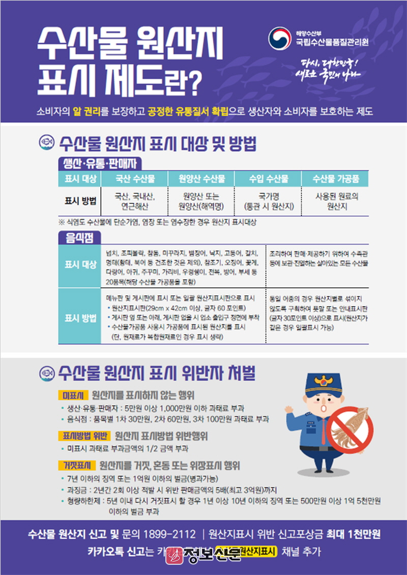 주요 단속 사항은 ▲원산지 거짓 표시 및 미표시 ▲표시 방법 위반 ▲거래내역 비치·보관 여부 ▲수입 수산물의 국내산 둔갑 및 혼합 판매 등이며, 원산지 거짓표시는 7년이하의 징역 또는 1억원 이하의 벌금, 적발 시 원산지 미표시는 최대 1,000만원의 과태료가 부과된다.