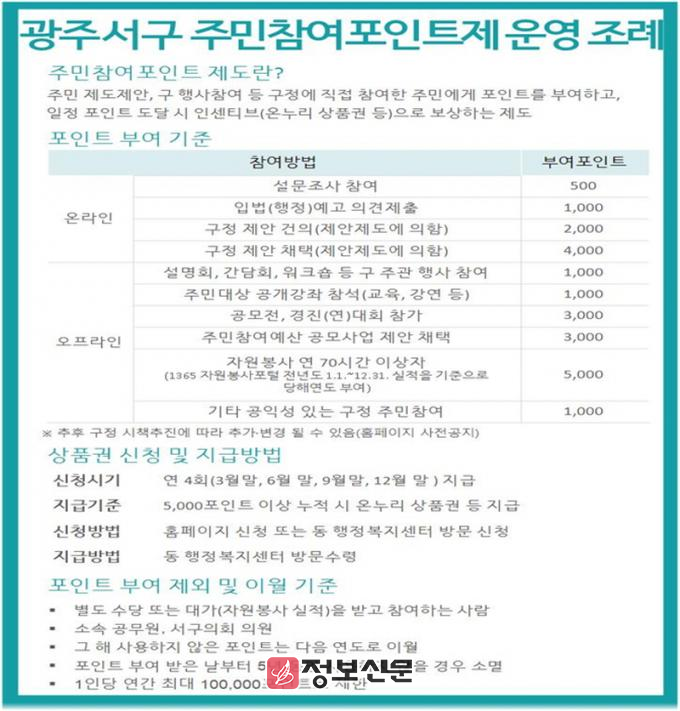 ![]() 광주 서구의회, 주민이 만든 서구 주민참여포인트제 운영 조례 최초 청구 |
