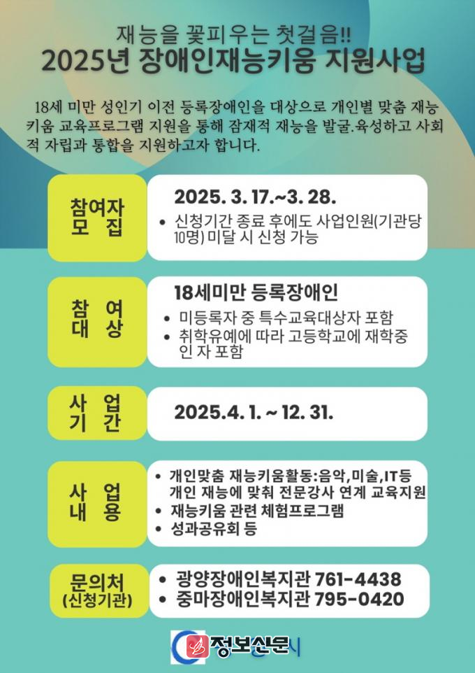 ![]() 광양시, ‘2025년 장애인 재능키움 지원사업’ 참여자 모집 |