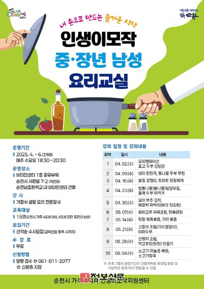 ![]() 순천시 인생이모작지원센터, 중·장년 남성 요리 교실 수강생 모집 |