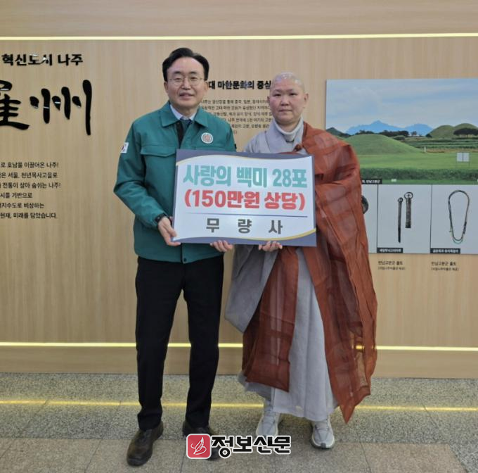 이날 기탁식에는 윤병태 나주시장과 하담 주지스님이 참석했다. 하담스님은 “작은 정성이지만 어려운 이웃들에게 따뜻한 위로가 되길 바란다”며 “앞으로도 지속적으로 관심을 갖고 나눔을 실천하겠다”고 말했다.