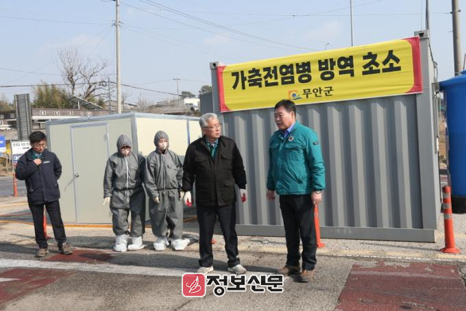 ![]() 김산 무안군수가 통제초소를 방문해 운영 상황을 점검하고 있다. |